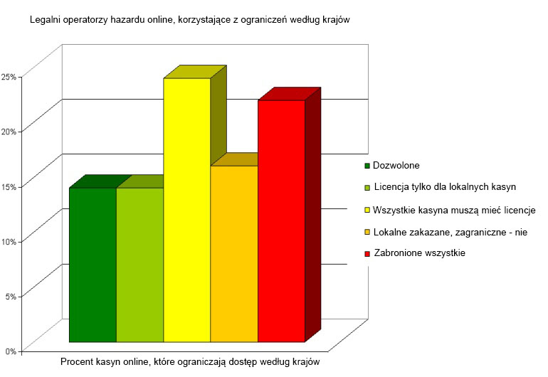 - W 61 krajach, aby otworzyć kasyno online, musisz uzyskać licencję od lokalnego rządu. W połowie z tych krajów wymagania licencjobiorcy są ustalane w taki sposób, że tylko lokalna firma może uzyskać zezwolenie. Bardzo często zagraniczni operatorzy akceptują zakłady bez posiadania licencji. Podobnie jak w poprzednim paragrafie, władze tych krajów nie chcą lub nie mogą powstrzymać nielegalnego hazardu online.
